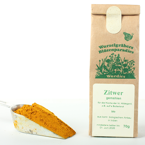 Mit seiner sanften Wärme enthält der Zitwer eine starke Kraft. Geschnitten, mit Galgant und ein wenig Honig in Wein gekocht, hilft er dem, der vor Schwäche zittert und bebt. Nicht heiß, aber warm getrunken hilft er ihm wieder zu Kräften und das Zittern wird aufhören. In ein Tüchlein (oder im Teebeutel) gebunden und über Nacht in einem Glas kaltem Wasser ausgezogen, hilft er dem verschleimten Mensch, wenn er es oft morgens kalt auf nüchternen Magen trinkt. Die Stirn und Schläfen mit diesem in Tuch gebundenen Zitwer zu befeuchten, hilft bei regelmäßigem Kopfweh. Backe mit gemahlenem Zitwer und Dinkelmehl an der Sonne oder im Backofen unter 50° Plätzchen und pulvere sie danach. Eine regelmäßige Prise davon auf die Zunge hilft bei unangenehmen Völlegefühl nach schweren Speisen und vor dem Schlafengehen.