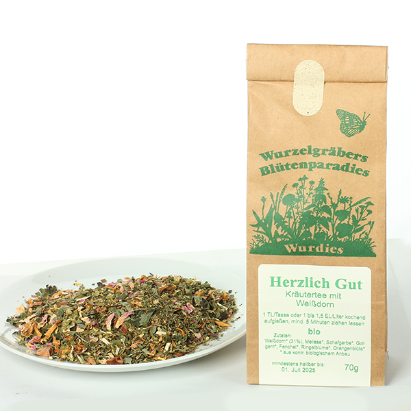 Zutaten: Weißdorn, Melisse, Schafgarbe, Galgant, Fenchel, Ringelblume, Orangenblüte, Alle Zutaten aus kontrolliert biologischem Anbau. Hersteller: Wurdies, Kreuzweg 6, 92557 Weiding, Deutschland